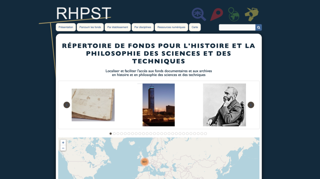 Dans le cadre du réseau professionnel thématique HiPhiSciTech, l’équipe du CAPHÉS a initié, en collaboration avec d’autres collègues, le Répertoire de fonds pour l’histoire et la philosophie des sciences et des techniques. Son but est de localiser, décrire brièvement et cartographier des fonds susceptibles d’être exploités par les historiens et les philosophes des sciences et des techniques dans le périmètre national. Il se présente comme un annuaire qui permet, par des liens, d’accéder à la documentation complète et aux instruments de recherche concernant les fonds conservés dans différentes institutions françaises.
