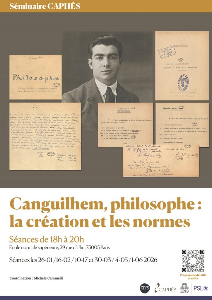 Dans la première partie du séminaire, nous interrogerons dans plusieurs perspectives la trajectoire qui commence avec l’étonnant ouvrage qui vient de paraître, Philosophie (1929-1932) : en portant l’attention sur le rapport entre théorie de la création et esthétique (M. Cammelli) et sur la façon de traiter le problème de la folie et ses transformations postérieures (F. Le Roux), en interrogeant ses limites en tant qu’elle présente une approche de la création de la valeur qui n’est pas encore ouverte sur la réflexion sur les normes (X. Roth) et en nous demandant par quel chemin le projet d’une thèse de doctorat (demeurée inachevée) sur le problème de la création, dans lequel Canguilhem avait engagé une réflexion axiologique au tournant des années 1930 a débouché, une décennie plus tard, sur une philosophie des normes (P.-O. Méthot). Dans la deuxième partie, nous nous intéresserons à la théorie canguilhémienne de la normativité vitale, en explorant son rapport constitutif avec la philosophie de la technique (M. Cammelli), son originalité dans l’approche de la maladie, notamment par rapport aux recherches phénoménologiques contemporaines (M. Dal Pozzolo), et la façon dont le « pluralisme normatif » qui en découle permet de relier différents axes de la réflexion canguilhemienne et de l’ouvrir également sur d’autres usages possibles dans les débats écologiques plus récents (A. Angelini).